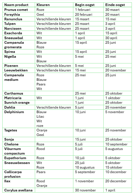 Ons doel is om jaarrond producten te kunnen leveren die geschikt zijn voor het boeket. Een product willen we minimaal 6 weken kunnen leveren.